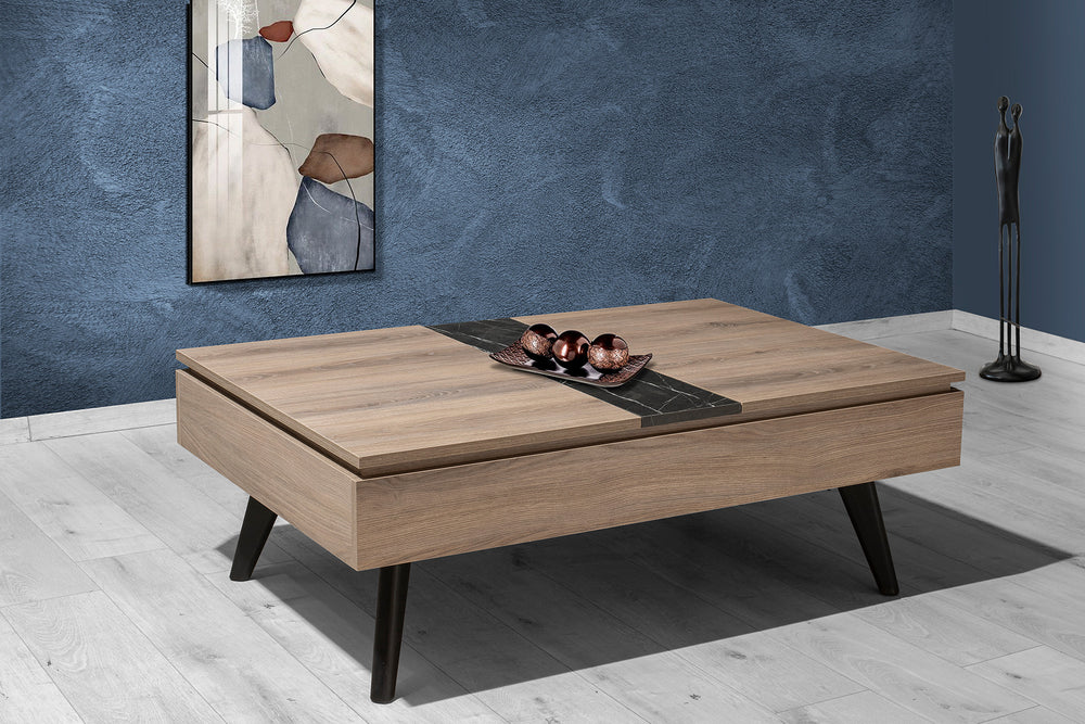 The “Armonia” coffee table combines the natural beauty of wood with modern details, creating an elegant and functional space for your living room. Its surface features a discreet marble touch in the center, offering a unique aesthetic and sense of luxury. With a geometric design and durable metal legs in a black shade, it is ideal for any modern or minimalist living room. A perfect piece that combines style and practicality, emphasizing elegance and timelessness.