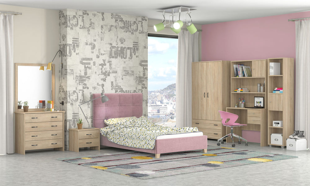 This children's room combines modern style with practicality, offering a pleasant and functional space for your child. The bed has a soft, pink headboard with fabric upholstery, offering comfort and support. Next to the bed, the bedside table and chest of drawers in natural wood tones provide plenty of storage space.