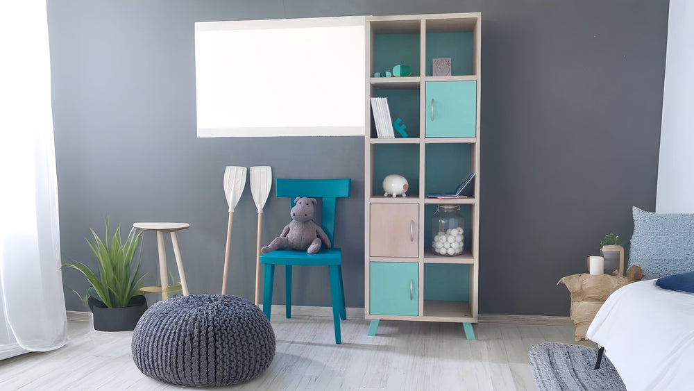 This bookcase combines modern design and functionality, ideal for children's or youth rooms. It features open and closed storage spaces, allowing easy organization of books, toys and decorations. The two-tone colors in natural wood and shades of blue add freshness and style to the space. It is manufactured in a variety of dimensions and shades to perfectly suit your needs.