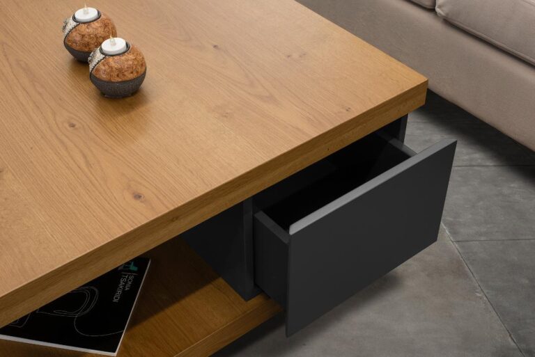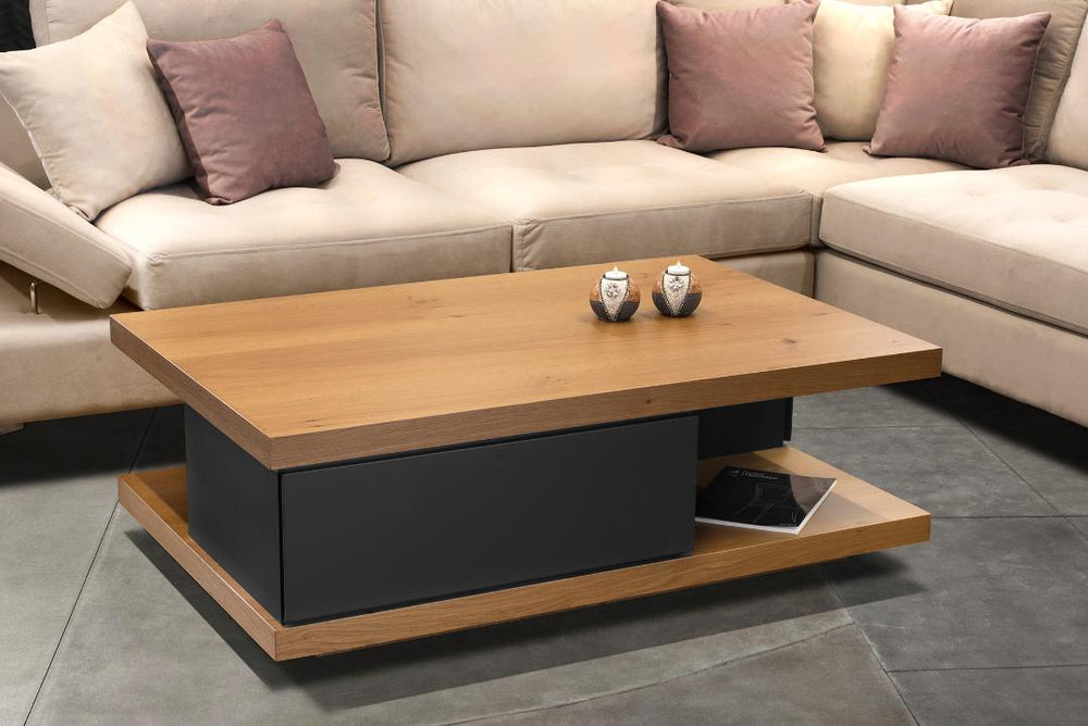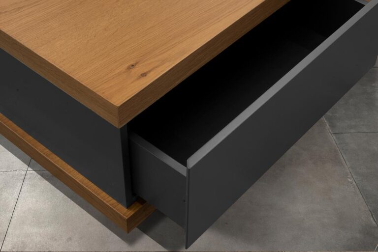 Contrast coffee table, with a wonderful rustic oak wood style that is the new fashion trend, as it is about the most natural, most authentic wood appearance with strong veins and knots. The contrast of the lacquer in combination with the natural wood gives another touch to your living room. In addition, you can order it in the wood color you desire so that it matches the rest of the decoration of your space completely, it will be a decorative but also practical addition thanks to the two drawers of different sizes and the interiors for an impressive and highly functional result in your space!