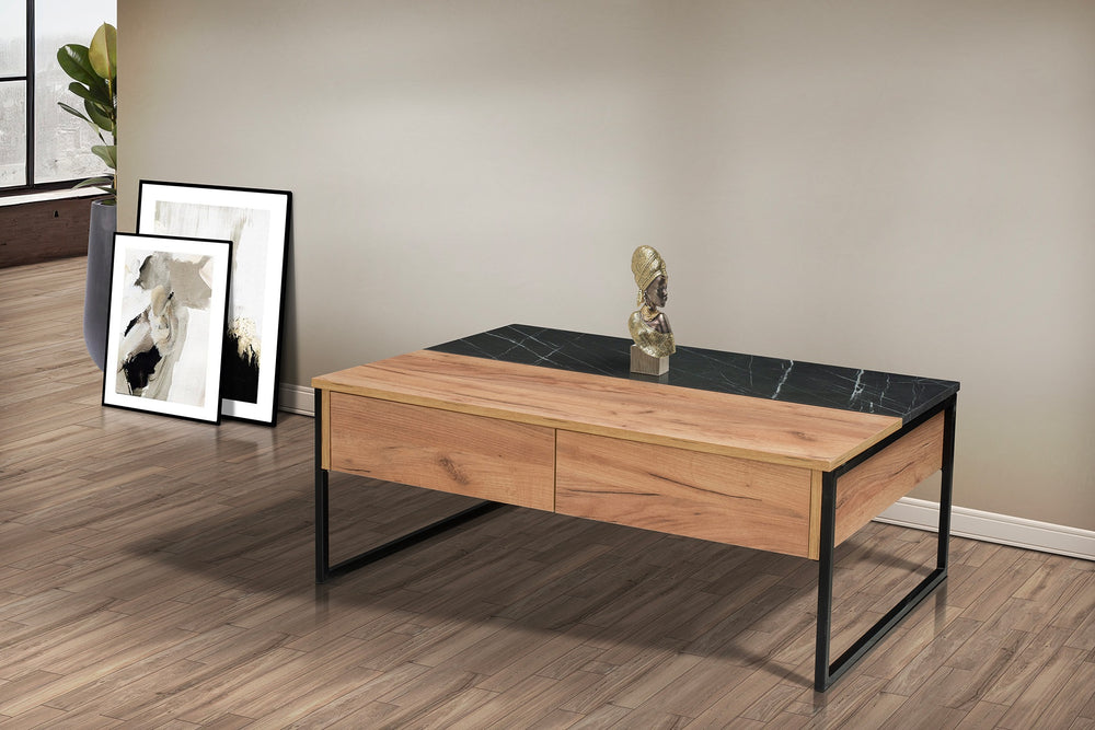 The Oro table is the ultimate expression of industrial minimal design. The elegant combination of natural wood with a black marble-like surface and a metal base creates a striking result that balances elegance and practicality.
