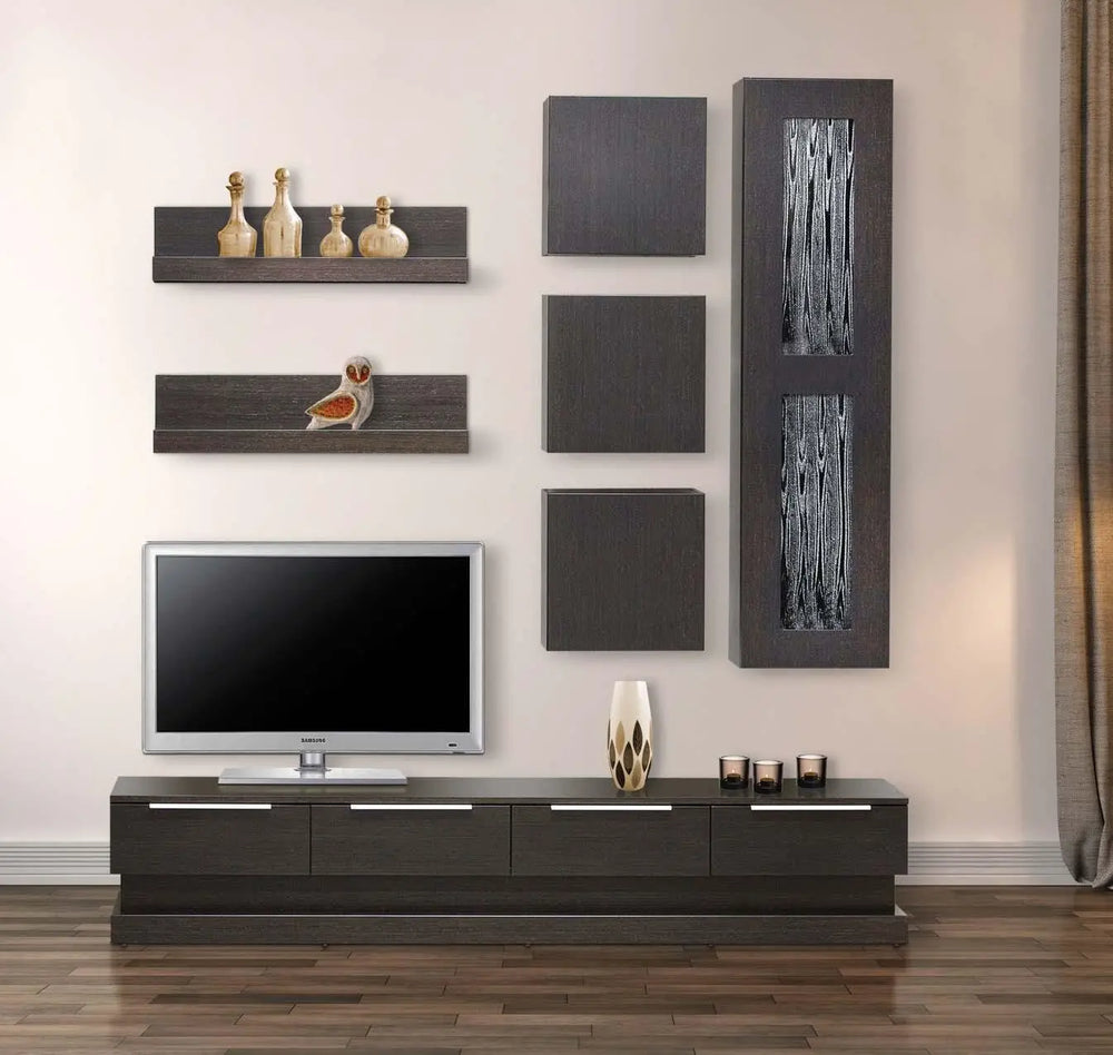 LIFE composite made of oak wood. A composition of impressive design to give your space special touches. Impressive elements are the crystals in the hanging display case, as well as the hanging cabinets and wooden shelves.