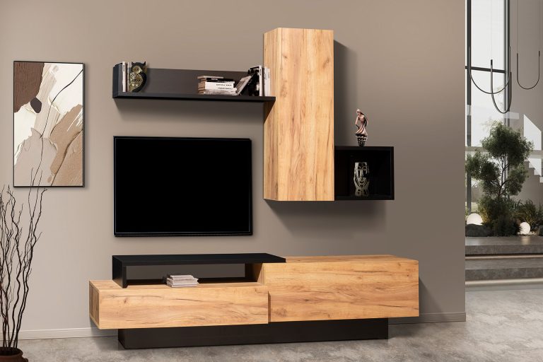 The Lynk TV stand stands out for its modern design with clean lines and smart space allocation. Natural wood surfaces combined with black matte elements create a dynamic yet elegant dialogue of materials. The wall-mounted vertical cabinet and open shelves offer storage and space for decorations, while the low cabinet supports the TV and organizes the space with style. A functional and aesthetically balanced piece for any modern living room.