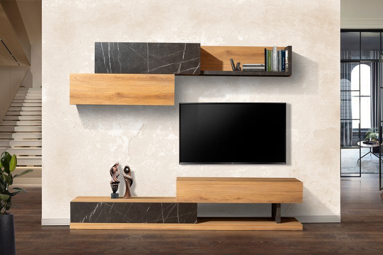 Marmo is a contemporary wall composition that harmoniously marries the authenticity of wood with the elegance of black marble texture. With modern geometric architecture and practical storage spaces, it offers functionality without sacrificing style. Marmo is the ideal choice for spaces that combine luxury with natural simplicity.