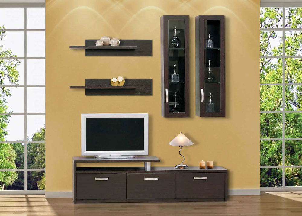 ROMA composite made of oak wood, in a timeless line and minimal design. It has come to integrate into your space with its uniqueness, designed to provide functionality and high aesthetics. With several storage spaces. The composite consists of 2 vertical elegant display cases and 2 large wall shelves, the base has 3 large cabinets as well as a slot for your consoles.