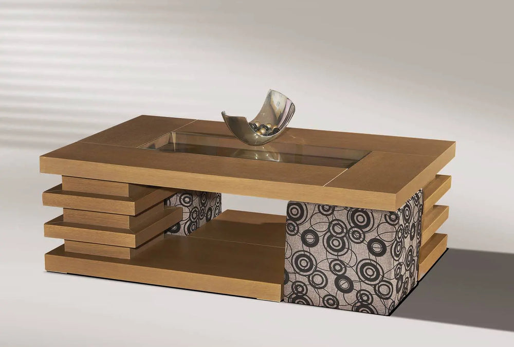 SERIFOS coffee table made of oak wood. Create a warm and modern living room. Wood dominates while there are also special glass details on its surface that create a welcoming space where you can enjoy living and relaxing. It also has 2 auxiliary stools for your guests.