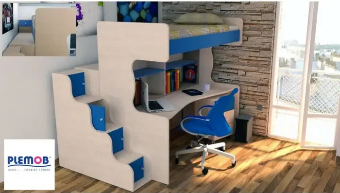 SIFNOS children's bunk bed. Is there no space in the child's room for an office? Then the solution is the raised bed, which has storage stairs instead of a standard ladder. In addition, the installation of lockable shelves on the bed steps makes the stairs serve as a bookcase, making this model even more attractive by creating additional storage space. The stairs to climb can be adjusted to both the right and left.