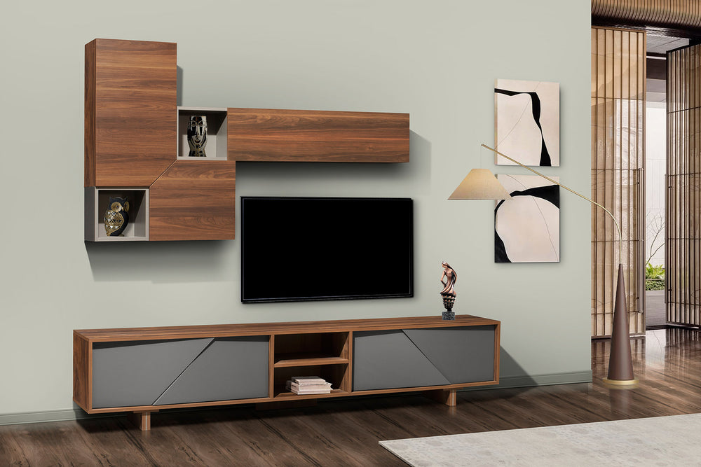 Vivo is a contemporary TV composition that combines natural wood with modern gray details, exuding warmth and minimal elegance. Its harmonious design, with ergonomic cabinets and open recesses for decorations, makes it ideal for any modern living room. Vivo breathes life into the space, offering practicality without sacrificing style.